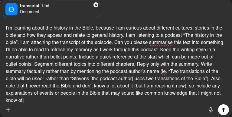 I then create a note for the episode (I use Notion, so each note/episode is a Notion page), attaching the transcript to it. Finally, I feed the transcript into ChatGPT (importantly, using the file upload feature rather than copy-pasting into the prompt, as that doesn’t work) and ask it to summarize it. I use a different prompt based on the podcast. Here is the Bible podcast prompt: